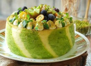 روی کیک را با خامه فرم گرفته ماسوره زده و پودر پسته الک کرده و با میوه تزیین کنید. برای مغز کیک می توانید محلبی یا پودینگ دلخواهتان را بریزید. فقط مواد باید طوری باشند که سفت بشوند و گرنه هنگام برش کیک، بیرون می زند و تمیز در نمی آید. یا مثلا ژله بریزید چون آبکی است جذب کیک می شود. می توانید گاناش هم استفاده کنید که مایع ژلاتین داشته باشد مثل مواد چیز کیک بهتر است.